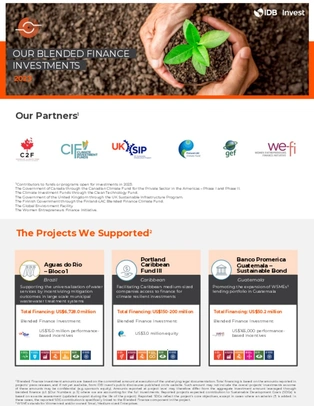11.26.2024 Factsheet: IDB Invest 2023 Blended Finance Investments Learn about our Blended Finance Investments with partners’ resources in 2023. Download publication: English Spanish