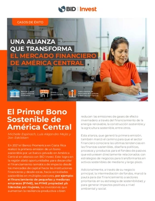 En 2021 el Banco Promerica en Costa Rica realizó la primera emisión de un bono sostenible por un banco privado en América Central en alianza con BID Invest. Este logro en la región abrió oportunidades para desarrollar el financiamiento temático de impacto desde los mercados de capital hacia las instituciones financieras y desde estas, hacia actividades sostenibles en múltiples sectores. Conoce el caso de éxito.