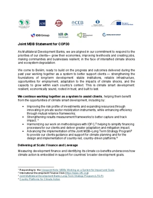 The Joint MDB Statement for COP30 reflects how Multilateral Development Banks (MDBs) reaffirmed in Belém (Brazil) their commitment to respond to their clients' priorities to improve livelihoods and create jobs for the resilience of communities and businesses in the face of intensified climate shocks and ecosystem degradation.